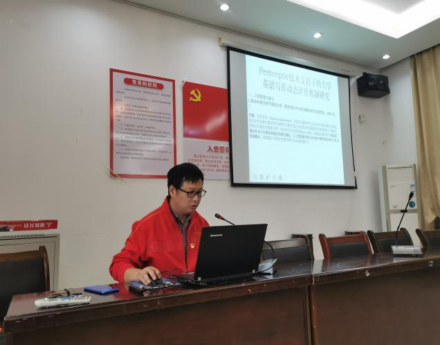 杜默君副教授围绕课题“Peerceptive技术支持下的大学英语写作动态评价机制研究”进行了案例分析。他就立项背景与意义、课题研究对象、研究内容及方法等进行了具体介绍,该课题将信息技术与语言教学研究相结合,为各位老师的课题研究提供了崭新的思路。