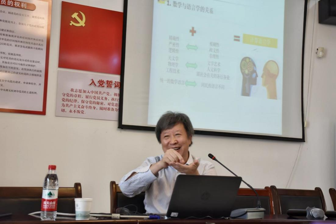 张教授从四个方面梳理了语言学、翻译学、数学与计算机科学的特性及它们之间的相互关系,分析它们之间的互建、互构、互补的学理机制,并以实例展示了数学与语言学的关系,以及数字化技术在翻译学研究中的应用。他指出翻译学的研究只有借助数字化技术的成果,才能走出自己更加辉煌的明天。接下来张教授将语言学与撰写论文相结合,讲述了写论文的十大要素以及该如何选词措句,并以各种已经发表了的论文为例,风趣幽默讲述了在撰写论文时的注意事项。