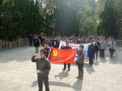 上午9点,一行人步行至方志敏烈士陵园。大家在党旗的引领下,进行了庄严的献花圈仪式,并在烈士墓前默哀三分钟。随后,学生党员代表徐敦鹏代表全体党员发表宣言,他呼吁全体党员要向方志敏烈士学习艰苦奋斗,不怕献身的精神,肩负起自己的使命。在庄严肃穆的气氛中,全体成员进行了党员宣誓仪式。