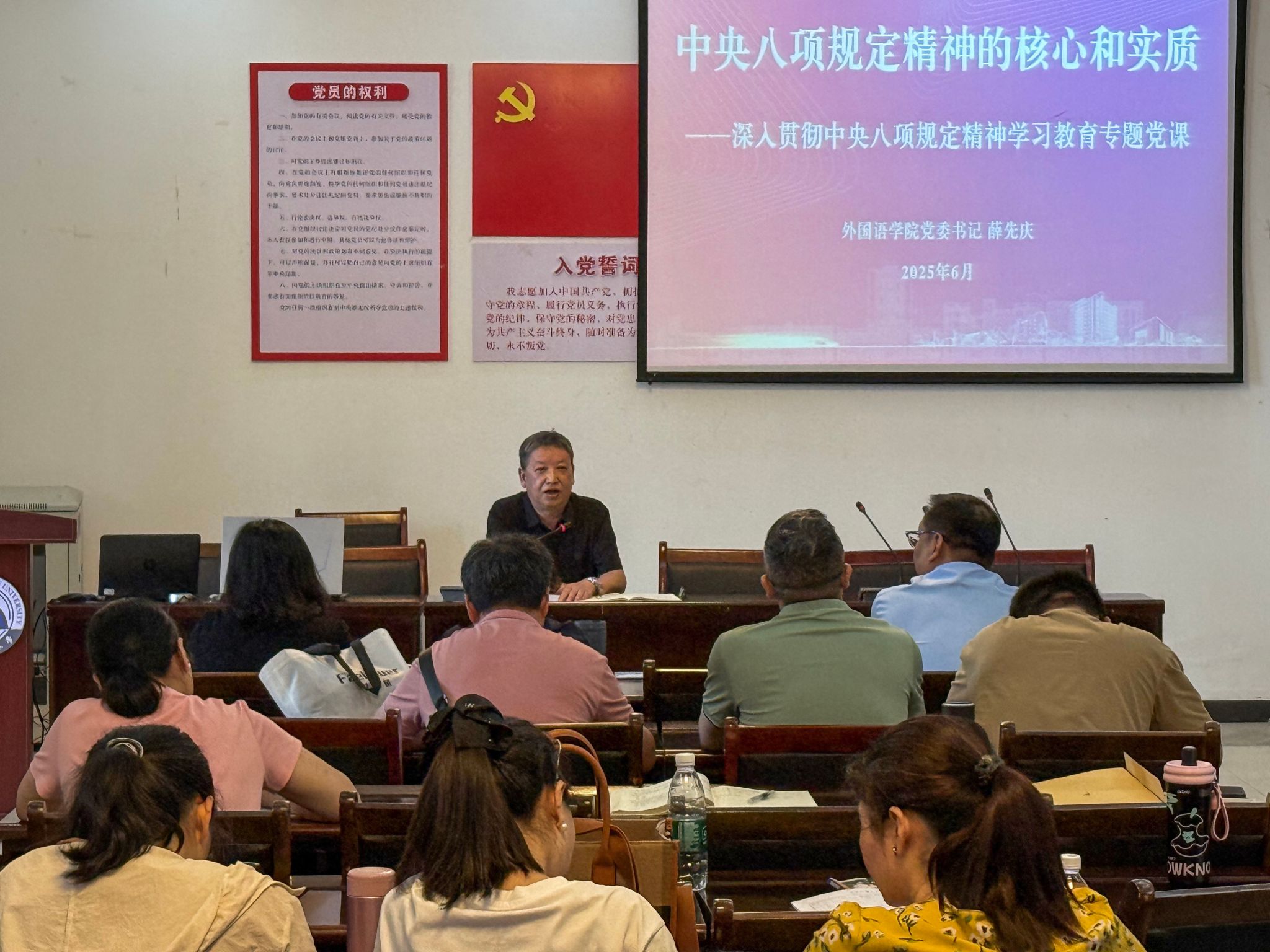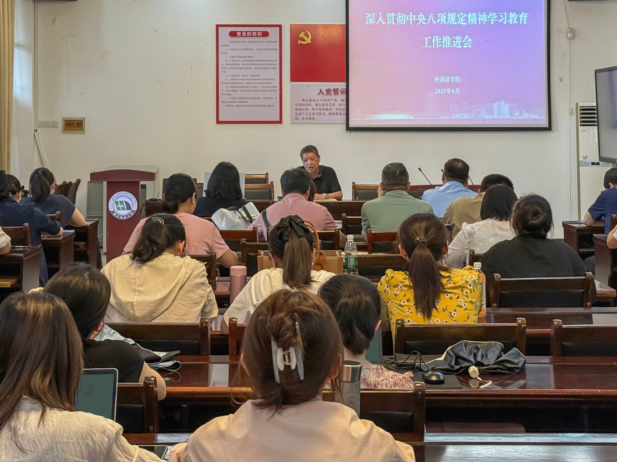 6月5日,外国语学院召开深入贯彻中央八项规定精神学习教育工作推进会暨专题党课,传达学习习近平总书记重要讲话和重要指示批示精神,阶段性总结学习教育推进情况,安排下一阶段重点任务,推动全院学习教育走深走实。学院党委书记薛先庆主持会议并以“中央八项规定精神的核心和实质”为题讲授专题党课,全体教工党员参加会议。