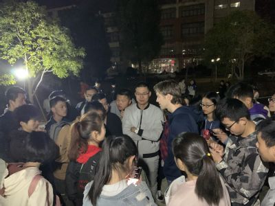 18级翻译2班主办的英语角活动在外院楼前顺利举行。Drew、Dahlin、Ms.Q三位外教应邀参加。