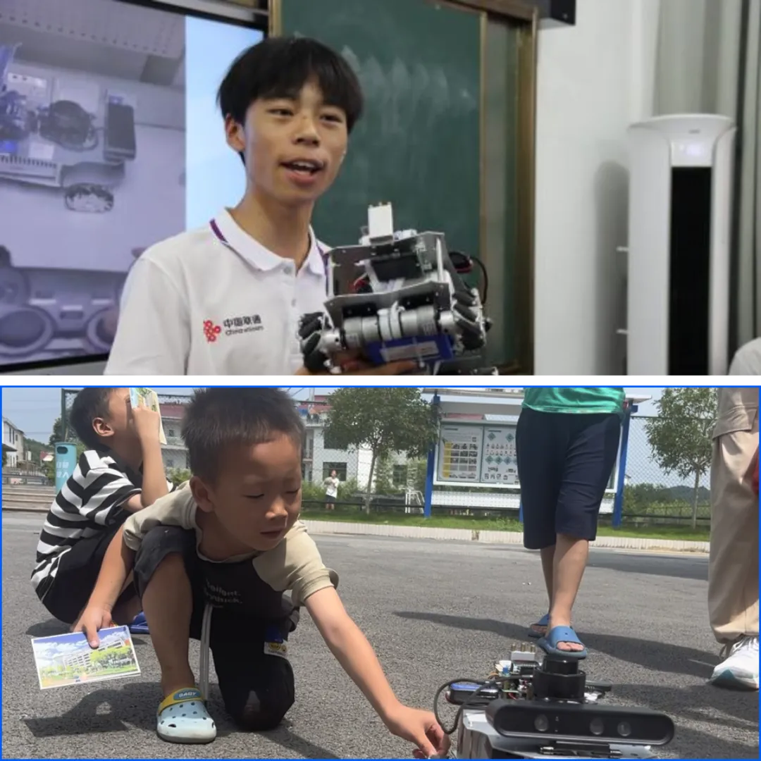同学研发的智能小车,讲解相关原理及基本构成。从“大脑”——主控板,到“眼睛”——深度相机和激光雷达,再到“脚”——麦轮,生动形象地向小朋友们描述了小车的构成,激发了孩子们对于人工智能的兴趣,在心里埋下了一颗科创的种子。
