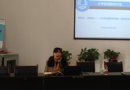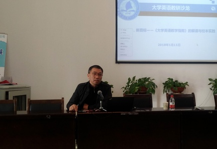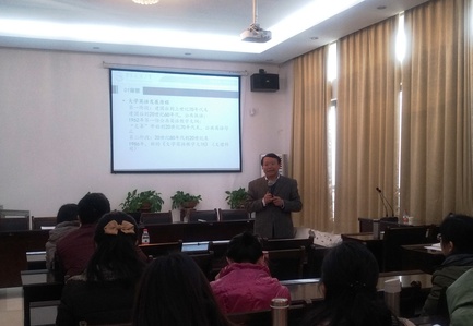 学科带头人袁平华教授作主旨报告,他带领全体大学英语教师对《大学英语教学指南》的研制背景、目的、要点进行了详细的解读,他对构建91论坛