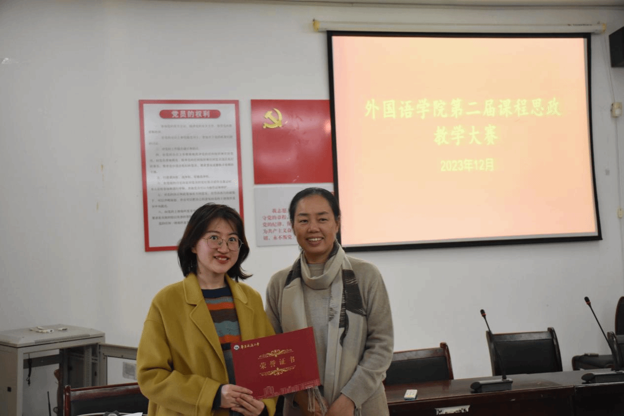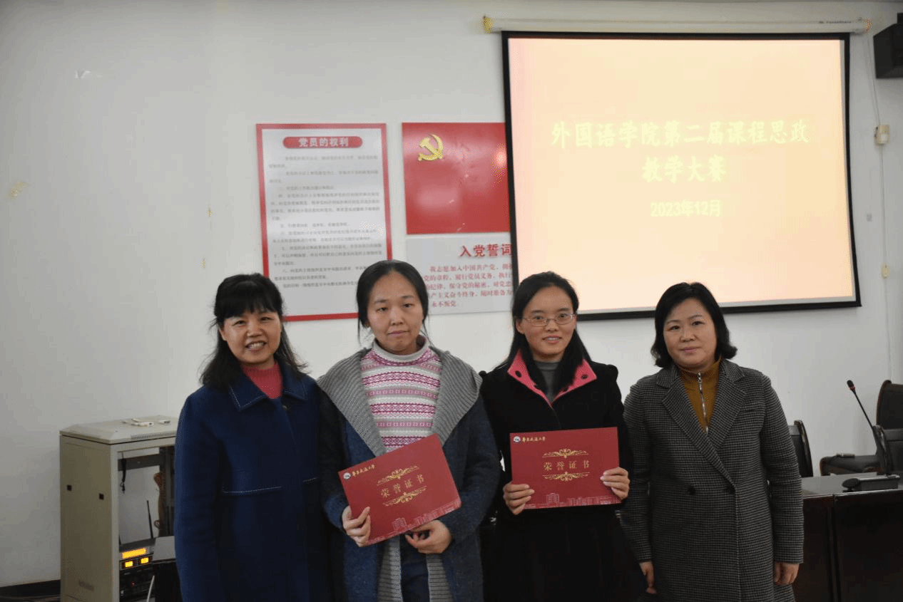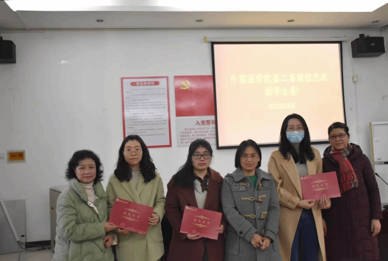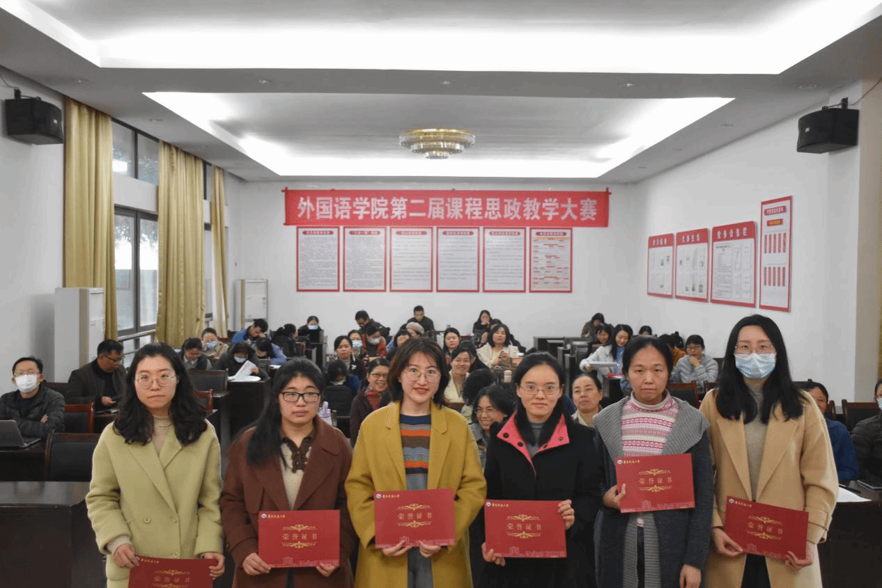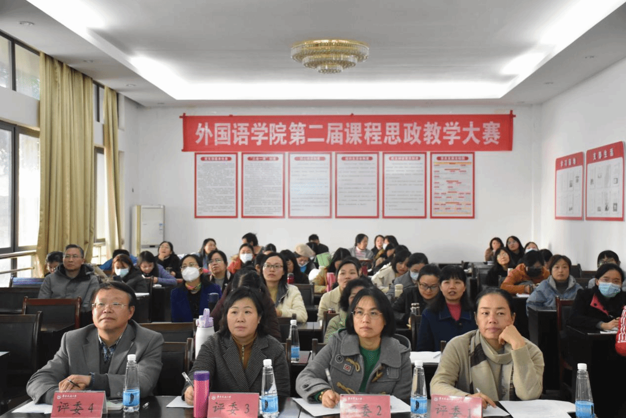 第二届课程思政教学大赛”于12月14日下午在外语学院102会议室举行。本次课程思政教学大赛由院分工会主席朱爱琴主持,赵小晶、单伟红、陆秀英、袁平华、何善秀、孟冬梅、黄珊担任评委,龚沁怡、刘星、吴秋芳、陶国潇、吴让越、朱佳琪六位老师参赛。