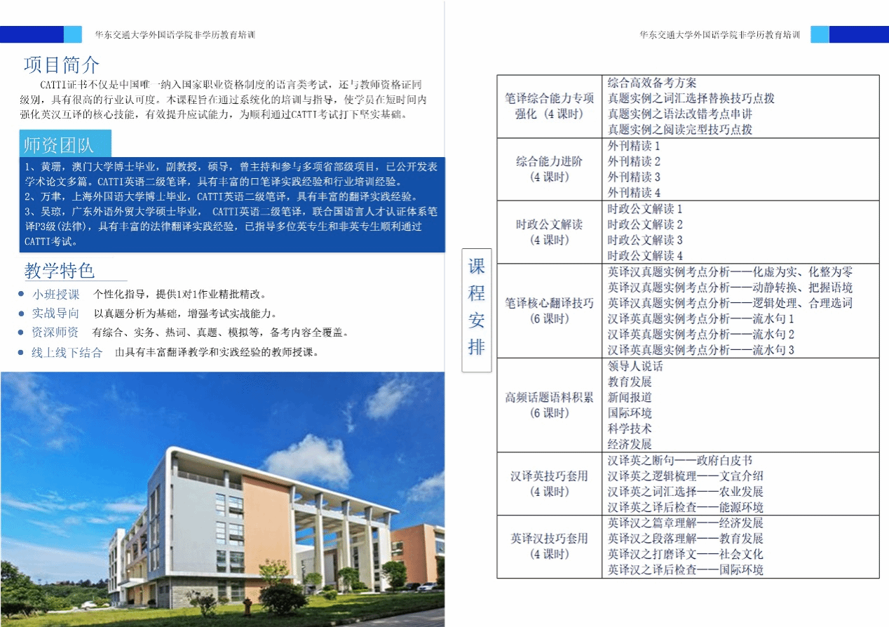 随着全球化进程的加速和国际交流的日益频繁,出国留学人员、高端应用型英语人才及英语口笔译人才的需求与日俱增。为满足社会对高素质英语人才的需求,华东交通大学91论坛 凭借其雄厚的师资力量、丰富的教学经验和先进的教学设施,特面向社会推出《雅思双阶全能冲刺班》、《CATTI二级笔译》、《CATTI三级笔译》及《英语口译》等培训课程。各课程项目简介、课程安排、教学特色及师资团队等详细信息见下图。