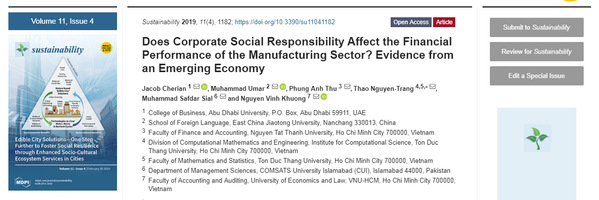 外籍教师Muhammad Umar博士以第二作者在国际期刊《Sustainability》发表高水平学术论文《Does Corporate Social Responsibility Affect the Financial Performance of the Manufacturing Sector? Evidence from an Emerging Economy》(企业社会责任会影响制造业的财务绩效吗?——来自新兴经济体的证据)。