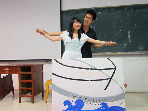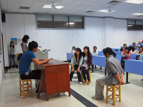肖家玮潘政报道)5月5日晚上7点,一年一度的91论坛 的英语剧大赛初赛在北区15栋118和116同时上演,来自外语学院10、11级共12个参赛班级在初赛中展现了各自的创作才华和表演才能,(大话西游)》笑料百出,high级英语4(不管明天变成如何)》表现了世界末日来临之际人性的觉醒,启迪我们要珍视眼前所有。