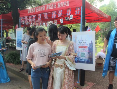 本届“红五月”英语文化艺术节以“中西文化交流”为主题,英文戏剧、英文小说、英文电影、英国王室和中国新疆、西藏、云南等省文化代表……从英语国家文化到大美中国风采,每个班级的展区都充满着文化气息,等待着同学们去感受。在一个“英式风情”的摊点上,精致的“英式”下午茶吸引了大批路人的驻足品尝,17英语(国贸)班通过独具特色的方式展示其主题“英国皇室”的魅力;17英语(国金)二班则用英文”快问快答“的方式,凸显91论坛