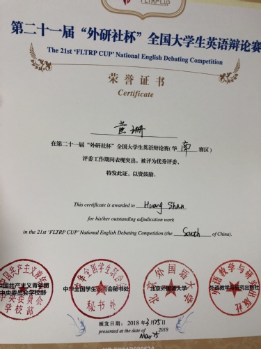 黄珊老师指导的刘嘉玉(14级英语国贸)和童宁(14级英语国贸),在第二十一届“外研社杯”全国英语辩论赛华南赛区98支队伍中突围,荣获二等奖,并晋级全国总决赛。同时,黄珊老师也连续三年获得该赛事“优秀评委”称号。
