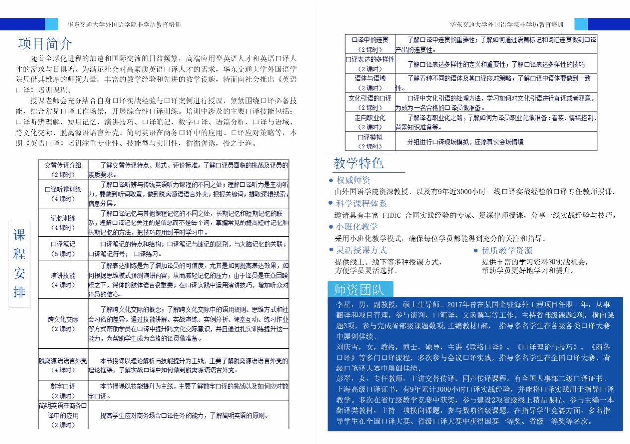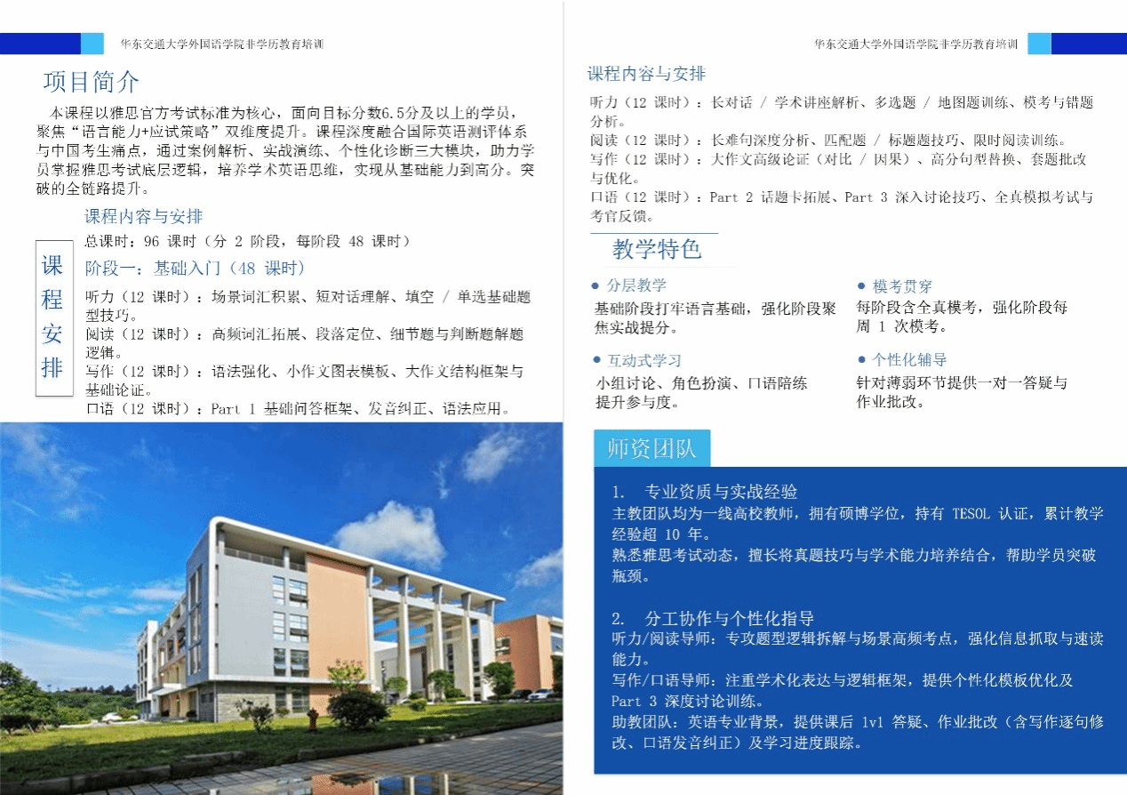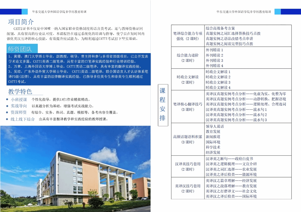 随着全球化进程的加速和国际交流的日益频繁,出国留学人员、高端应用型英语人才及英语口笔译人才的需求与日俱增。为满足社会对高素质英语人才的需求,华东交通大学91论坛 凭借其雄厚的师资力量、丰富的教学经验和先进的教学设施,特面向社会推出《雅思双阶全能冲刺班》、《CATTI二级笔译》、《CATTI三级笔译》及《英语口译》等培训课程。各课程项目简介、课程安排、教学特色及师资团队等详细信息见下图。